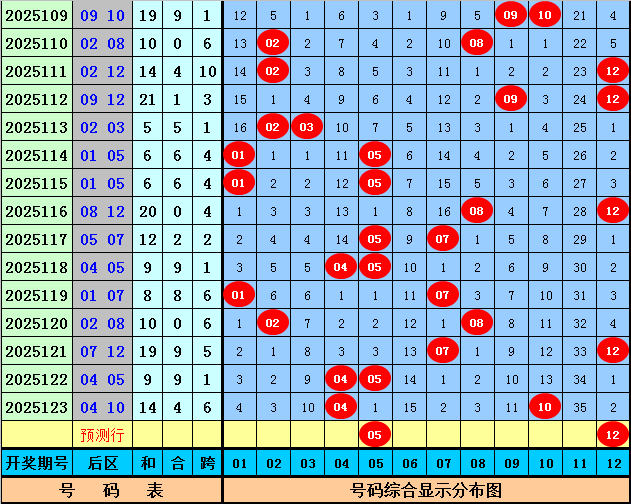 后区分析:上期后区开出号码04和10,最近10期后区奖号奇偶比为11:9,大小比为8:12,本期后区看好号码02、03、05、06、12,后区单挑两码05、12。