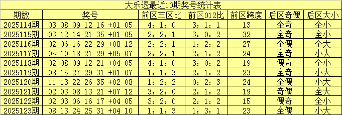 大乐透第2025123期奖号开出:08 13 24 25 31 +04 10。其中前区三区比为1:1:3,012路比为1:3:1,后区开出一大一小、全偶奖号。