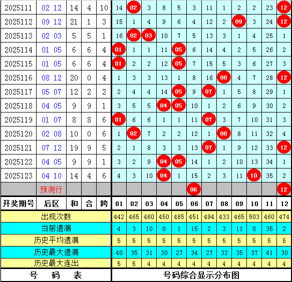 和值跨度:上期和值开出101,对比第2025122期和值上升了57个点位,本期预计和值在大号区域热出,看好出现在104周围。