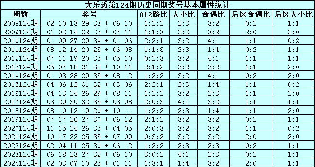 前区大小比推荐:第124期历史同期奖号中,号码大小比总比例为45:40,其中大小比0:5→0次、1:4→1次、2:3→6次、3:2→8次、4:1→2次、5:0→0次,开出比例较高,本期注意大号再次热出,关注大小比3:2。
