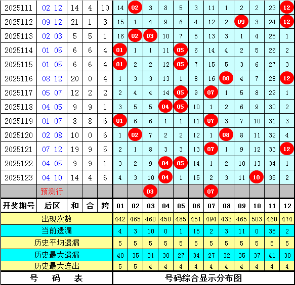 其中,后区012路比4:7:9,奇偶比5:15,大小比11:9,本期一码看好07。