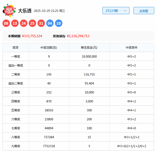 大乐透第2025123期开出奖号为:08、13、24、25、31+04、10。其中前区奇偶比为3:2,三区比为1:1:3,大小比为3:2,后区开出全偶组合。