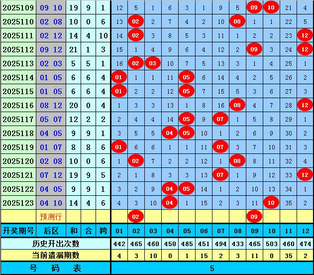 后区第二位推荐:在连续5期开奖中分别出号:07、08、12、05、10,均值为8.4,其中奇数奖号表现较冷,本期适当关注回补,参考奇数号码09。