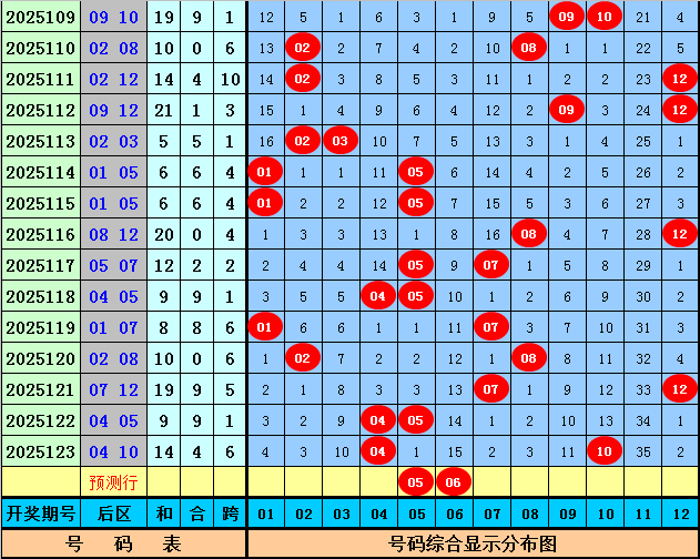 后区分析:后区上期开出号码04和10,分别遗漏0期和13期,目前后区01-12区间冷温热号码个数比为3:2:7,本期后区注意号码05+06。