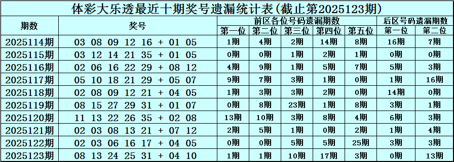 第2025123期奖号:08 13 24 25 31 + 04 10 ,各位号码遗漏期数为:1期、1期、10期、17期、3期 + 0期、13期。