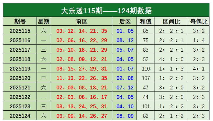 大乐透第2025124期出奖号统计:前区06、09、14、26、27,后区08、09。和值为82,区间比为2:1:2,奇偶比为2:3。