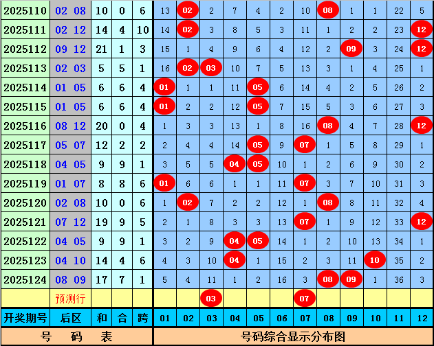 后区号码分析:第125期历史同期开奖中,后区两码一大一小开出8次,全大开出3次,全小开出6次,本期后区预计出现一大一小奖号,参考号码03、05、07、11。