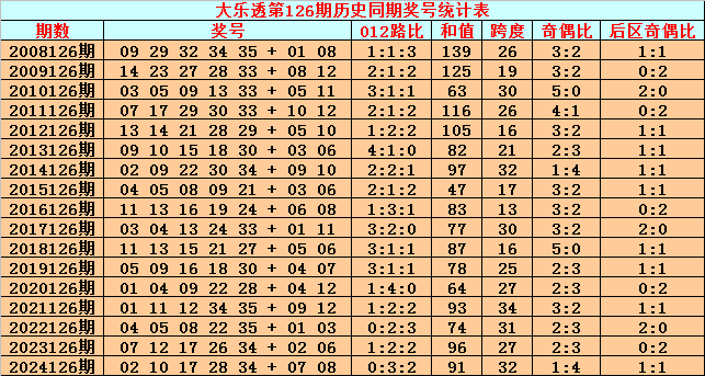 综上所述,大乐透第2025126期前区012路比参考2:2:1。
