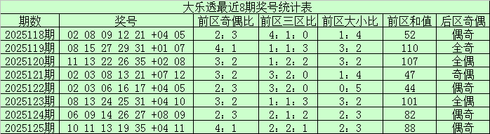 前区奇偶走势:上期前区奖号奇偶比为4:1,近8期前区奖号奇偶比为23:17,奇数号码走势较热,本期注意偶数号码转热,看好奇偶比2:3。