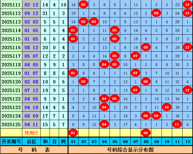 后区分析:上期后区开出号码04和11,最近10期后区奖号奇偶比为9:11,大小比为11:9,本期后区看好号码01、05、06、07、08,后区单挑两码01、08。