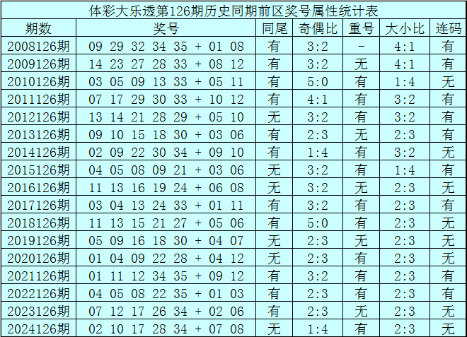 体彩大乐透第126期历史同期开出17次奖号,其统计详见下表: