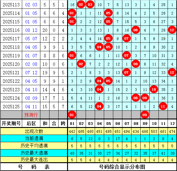 和值跨度:上期和值开出88,对比第2025124期和值上升了6个点位,本期预计和值在大号区域热出,看好出现在113周围。