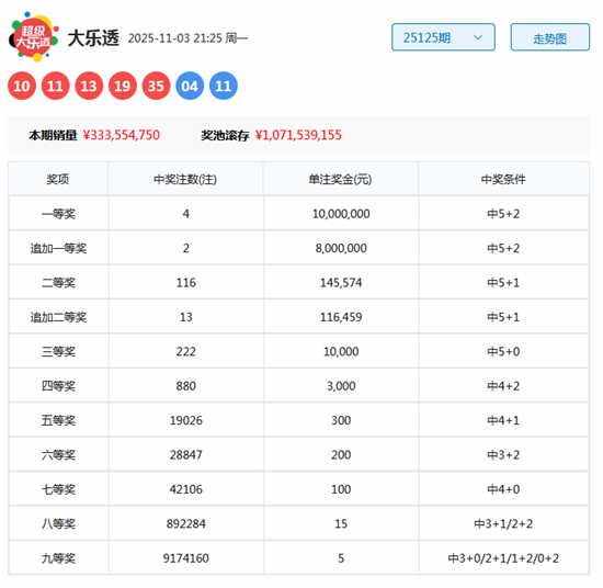 上期开奖:体彩大乐透第2025125期开奖号码为:10 11 13 19 35 + 04 11。