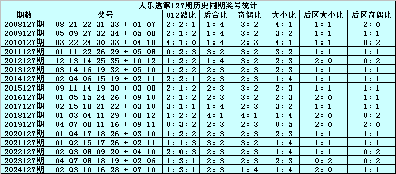 体彩大乐透第2025127期历史同期开奖号码分析: