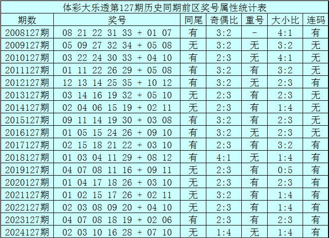 体彩大乐透第127期历史同期开出17次奖号,其统计详见下表: