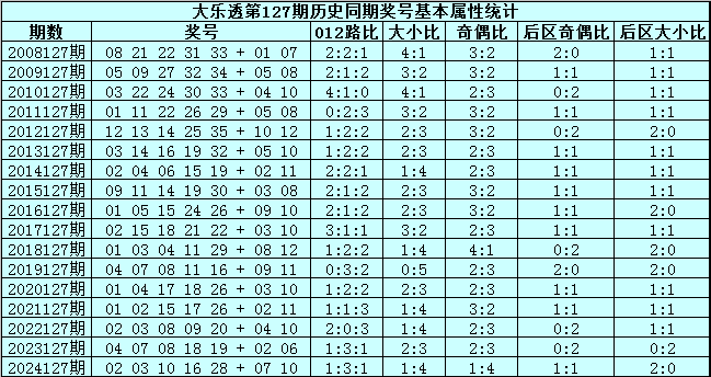 前区奇偶比推荐:第127期历史同期开奖中,号码奇偶比总比例开出5:80,其中奇偶比0:5→0次、1:4→1次、2:3→2次、3:2→1次、4:1→1次、5:0→0次,奇数出现较少,本期注意回补,参考奇偶比3:2。