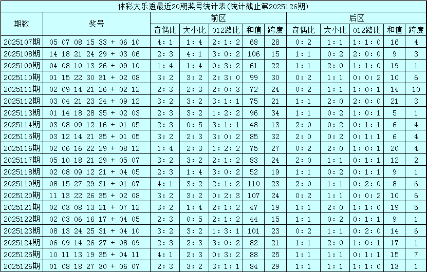 其中前区奖号奇偶比为51:49,大小比为42:58,012比为38:26:36,跨度出现范围在13-34区段,和值出现范围在44-110区间。