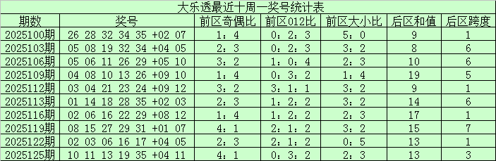 前区大小走势:上期前区大小比为3:2,上周一号码大小比2:3,最近十周一大小 号码走势基本平衡,本期看好小 号热出,参考大小比1:4。
