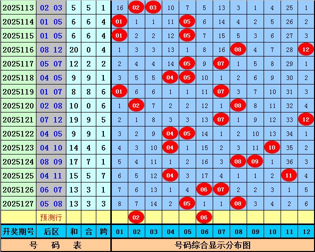 后区奖号分析:上期后区开出奖号05+08,奖号和值为13,跨度为3,本期预计后区和值转小,关注两码02 06。