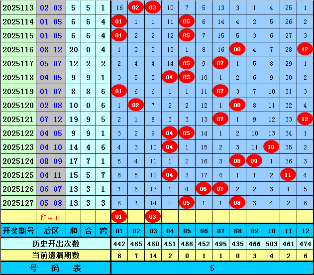 后区分析:上期后区开出一大一小组合:05+08,最近10期后区奖号大小比为10:10,本期预计后区开出全小组合,看好两码01、03。