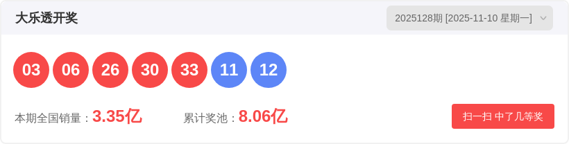 超级大乐透25128期开奖结果03 06 26 30 33 + 11 12,跨度30,三区比2:0:3,蓝球号码012路为2路、0路、奇偶为奇、偶。