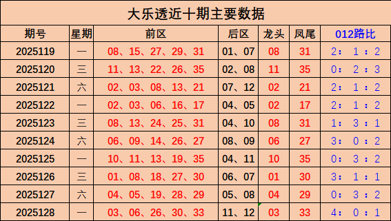 大乐透上期开奖号前区为:03 06 26 30 33,后区11 12;012路比4:0:1,龙头开出03,凤尾开出33