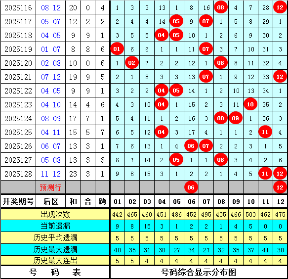 和值跨度:上期和值开出98,对比第2025127期和值上升了13个点位,本期看好和值走小,关注小 号区域和值,预计在87附近。