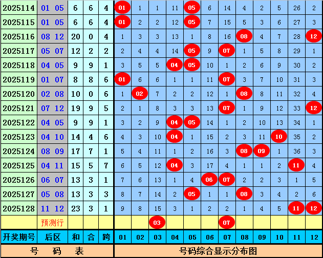后区分析:上期后区奖号为11+12,开出全大组合,上周三后区奖号开出06+07,最近十周三后区奖号大小比为11:9,大小 号码走势基本相当,本周三看好大小 号码继续平衡,关注两码03、07。