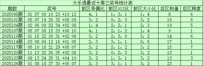 前区奇偶走势:上期前区奇偶比为2:3,上周三前区奇偶比2:3,最近十周三奇数号码表现占优,本期看好奇数号码继续走热,推荐奇偶比4:1。