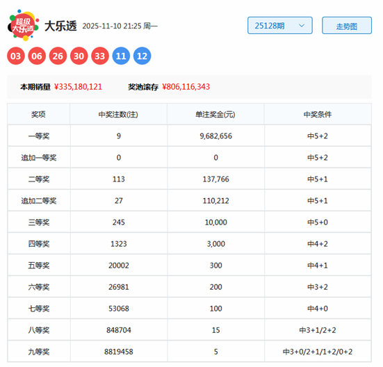 大乐透第2025128期奖号为:03、06、26、30、33+11 12,其中前区奇偶比为2:3,大小比为3:2,和值为98,后区和值为23,跨度为1。