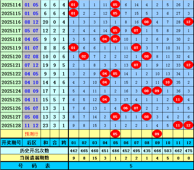 后区分析:上期后区奖号为11和12,最近5期后区和值分别为17、15、13、13、23,后区跨度分布范围在1-7,本期后区注意两码05、09。