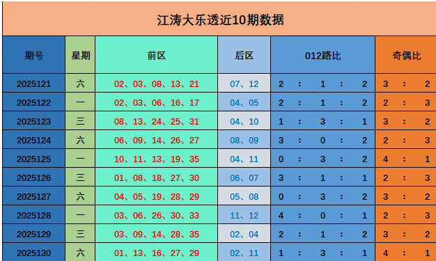 上期后区开出2路2路号码02,11。近10期012路比4:7:9,2路号码占优。本期预测后区开出2路2路号码05,08
