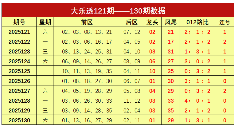 大乐透第2025130期出奖号统计:前区01、13、16、27、29,后区02、11。龙头01,凤尾29,012路比为1:3:1,未开出连号。