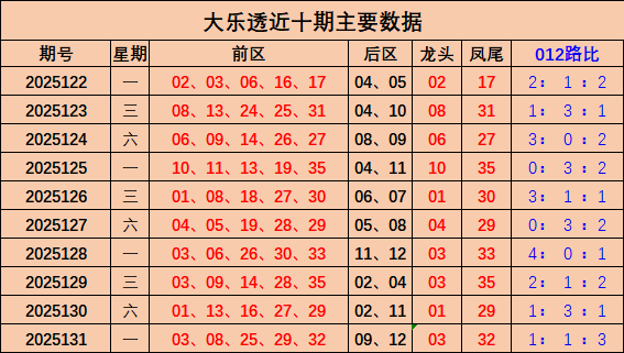 大乐透上期开奖号前区为:03 08 25 29 32,后区09 12;012路比1:1:3,龙头开出03,凤尾开出32