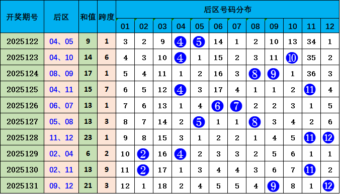 后区分析:上期后区开出09 12,跨度3,近十期跨度是:1、6、1、7、1、3、1、2、9、3,波动范围较大,跨度范围在1-9之间,本期预计跨度值上升,重点关注号码05 10,跨度5。