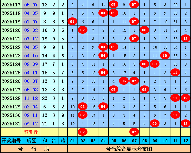 后区号码分析:第132期历史同期开奖中,后区两码全大开出3次,全小开出4次,一大一小开出10次,本期后区预计出现一大一小奖号,参考号码02、04、07、10。