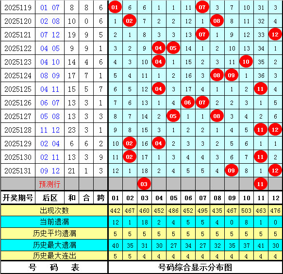 石浩第2025132期大乐透后区分析:后区上周星期三后区奖号为02和04,上期开出奖号09和12,最近9周星期三与最近9期后区奖号奇偶比分别为5:13和7:11,大小比分别为7:11和11:7,本期预计后区开出全奇组合,参考号码03、05、09、11。