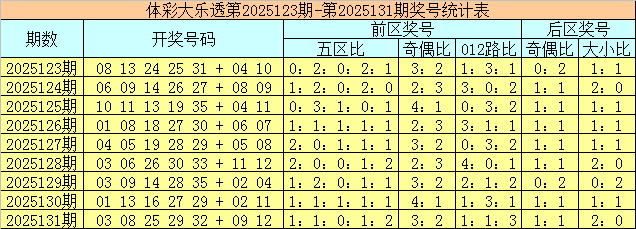 体彩大乐透第2025131期奖号为03 08 25 29 32 + 09 12,前区号码五区比为1:1:0:1:2,奇偶比为3:2,012路比为1:1:3,后区号码奇偶比为1:1,大小比为2:0。