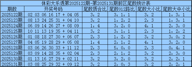 体彩大乐透第2025131期开奖号码为:03 08 25 29 32 + 09 12其中前区奖号奇偶比为3:2,大小比为3:2,012路为1:1:3,前区尾数质合比为3:2,012路比为2:0:3,大小比为3:2,大中小比2:2:1。