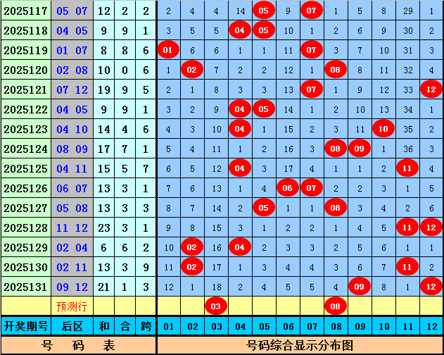 后区分析:后区上期开出号码09和12,分别遗漏6期和2期,目前后区01-12区间冷温热号码个数比为2:5:5,本期后区注意号码03+08。