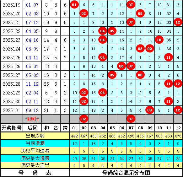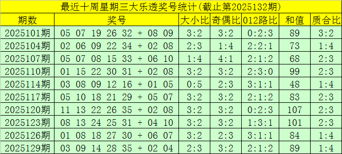 后区分析:最近10周星期三全大开出1次,全小开出2次,一大一小开出7次;一奇一偶开出2次,全奇开出2次,全偶开出6次,本期后区注意两码02+07。
