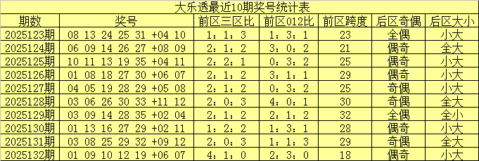 大乐透第2025132期奖号开出:01 09 10 12 19 +06 07。其中前区三区比为4:1:0,012路比为2:3:0,后区开出一大一小、一奇一偶奖号。