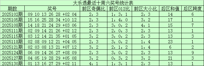 前区和值走势:上期前区和值为51,上周六和值开出86,最近10周六前区和值大小比为2:8,小 号和值出现较多,本六注意和值走小,关注70-80区间的和值。