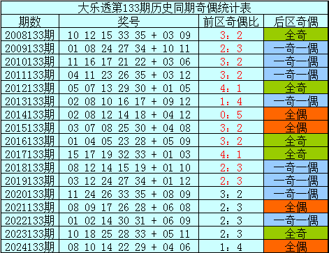 前区第四位:在历史第133期同期开奖中分布范围在14-33区段,平均值为25.1,奇偶比为9:8,目前该位偶数号码连续出现4年,今年同期该位看好偶数号码再出,关注号码24。