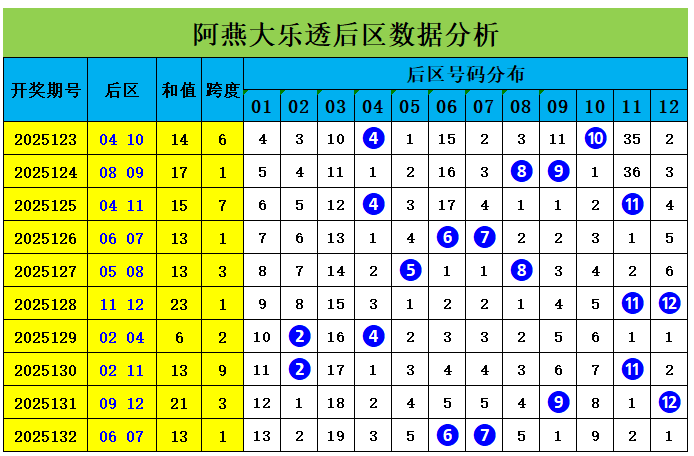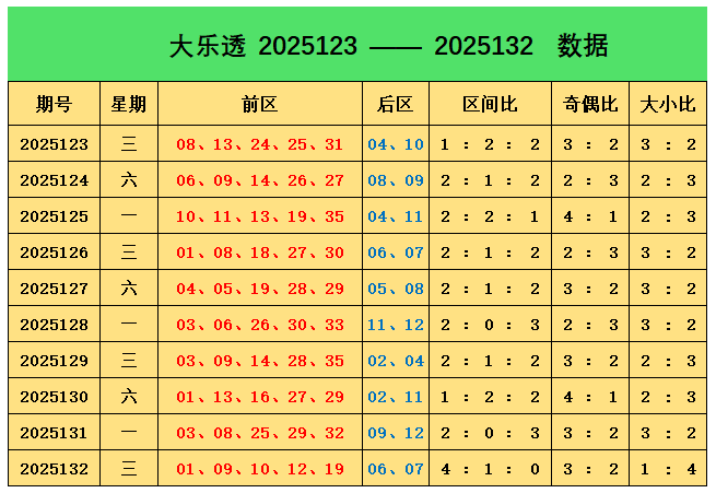 上期回顾:大乐透第2025132期奖号为:前区01、09、10、12、19,后区06、07,前区奖号三区比为4:1:0,奇偶比为3:2,大小比为1:4,后区开出小大组合06、07
