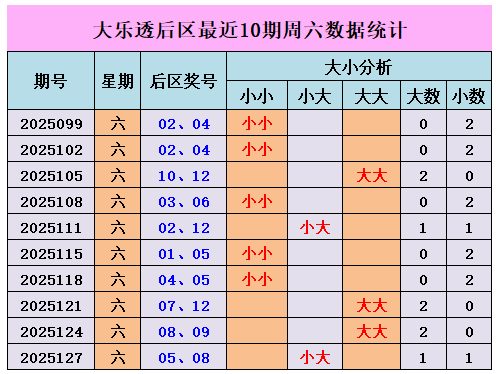上个周六后区奖号05、08。为小大组合。最近10个周六中,后区奖号大小比为8:12,小码奖号走势稍热,上个周六后区开出小大组合,本期后区关注小大组合,推荐号码:06 10