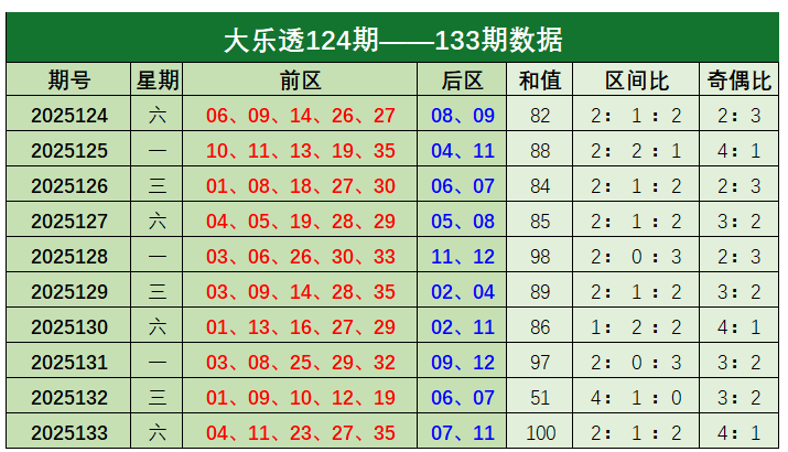 大乐透第2025133期出奖号统计:前区04、11、23、27、35,后区07、11。和值为100,区间比为2:1:2,奇偶比为4:1。