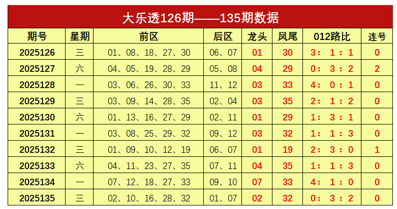 大乐透第2025135期出奖号统计:前区02、10、16、28、32,后区01、07。龙头02,凤尾32,012路比为0:3:2,未开出连号。