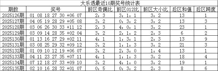 大乐透第2025135期奖号为:02 10 16 28 32+01 07。当期前区奖号012路比为0:3:2,冷热比为2:3,没有开出重号和连码,后区开出全奇、一大一小组合。