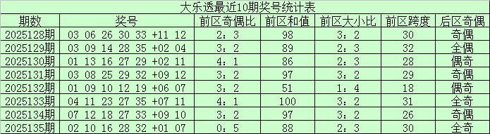 大乐透第25135期奖号为:02、10、16、28、32+01、07。其中前区和值为88,奇偶比为0:5,大小比为2:3。后区为一大一小、全奇组合。